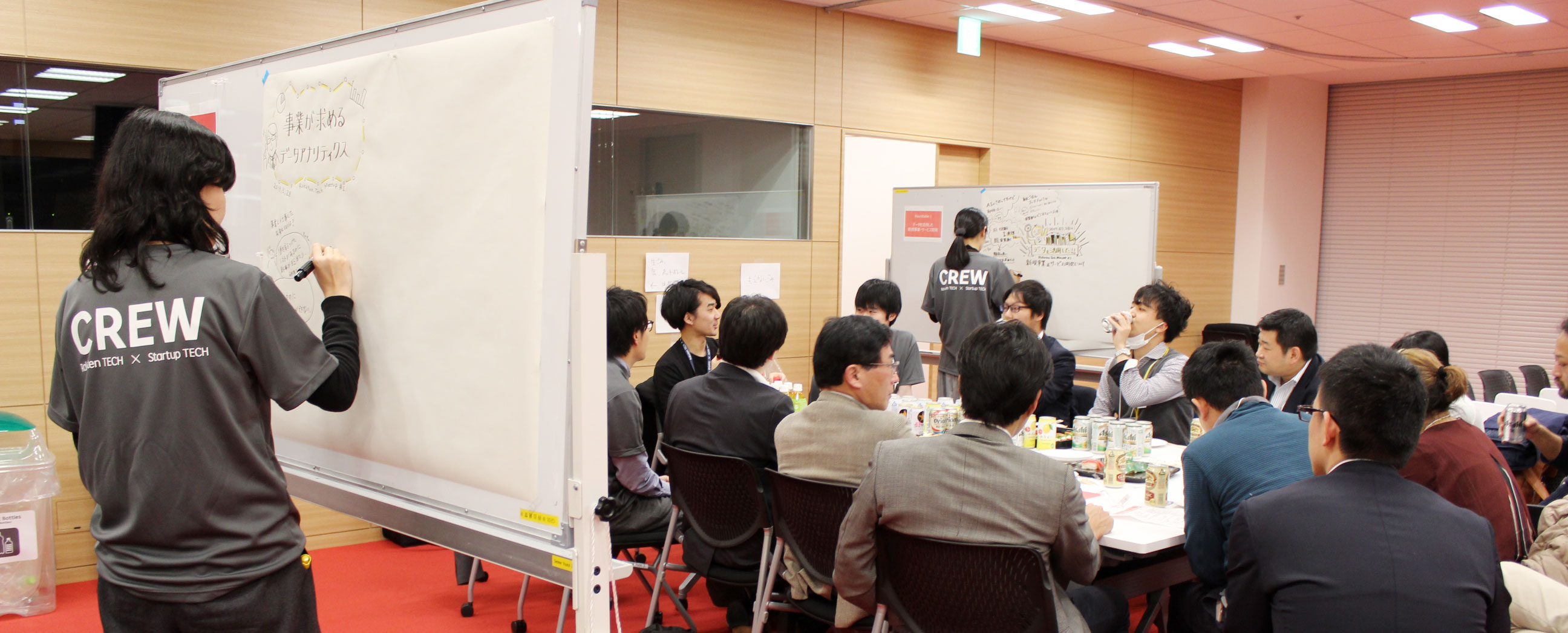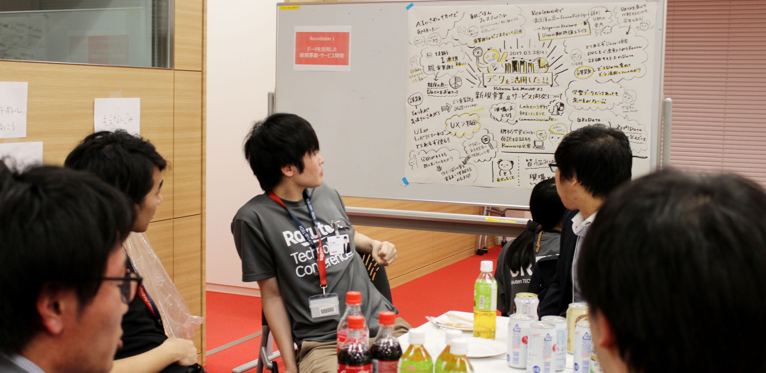 最後に、楽天のグラフィックレコーダー3名に参加してもらい、3つのグループで懇親会及び、テーマ別ディスカッションを行いました。グラフィックレコーダーが議事録をインフォグラフィック化するという試みを交え、現場目線で奥深いディスカッションが行われました。話が進むにつれ、みるみるインフォグラフィックが完成していく様は傍で見ていて、とても興味深かったです。内容は、オンプレvsクラウド、技術者と事業の距離感、現場でのコミュニケーション、ユーザーエクスペリエンスの意外な重要性、データガバナンス問題、開発の苦労話諸々等、新鮮な情報がぎっしり詰まった物になっていました。