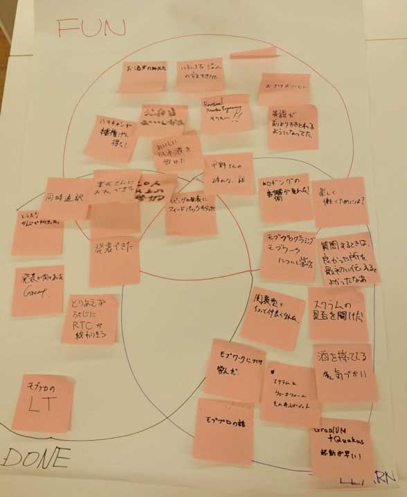 最後は参加者全員でFun Done Learnで振り返りを行い、今日1日で楽しかったこと、行ったこと、学んだことを付箋で貼って頂きました。